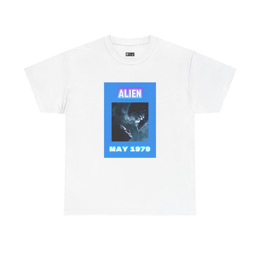 Alien unisex heavyweight tee shirt. A chilling tribute to Ridley Scott’s sci-fi horror masterpiece, capturing the fateful encounter of human and xenomorph, framed in neon tones with “ALIEN” and “MAY 1979.” Wear the terror that redefined cinema.