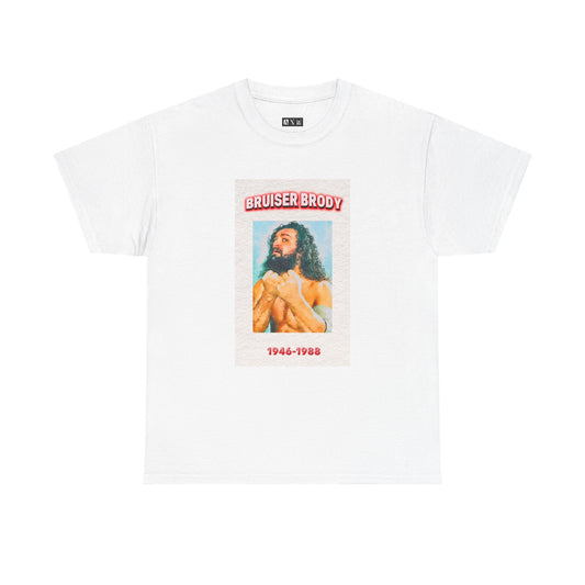 Bruiser Brody unisex heavyweight tee shirt. It blazes with power and pride. It features his iconic image and lasting years, it’s more than a shirt—it’s a tribute to the wild heart of professional wrestling.