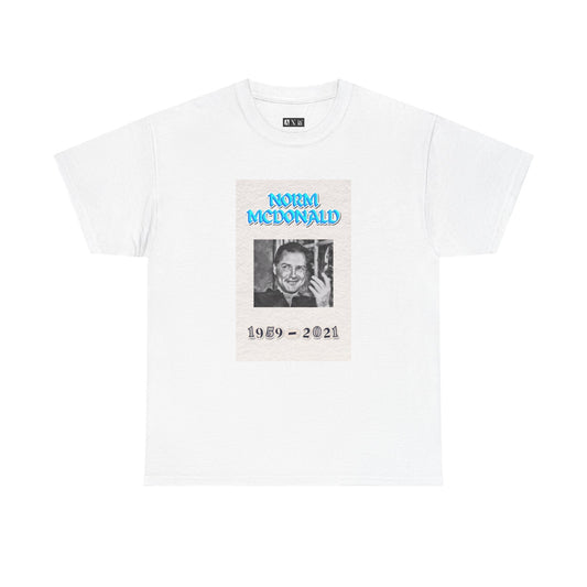 Norm McDonald black unisex heavyweight tee shirt honoring the comedy legend. It features a smiling portrait with electric blue lettering and the years 1959–2021. A timeless tribute to be enjoyed by any Norm McDonald fan.