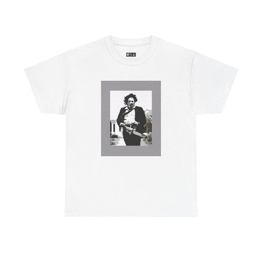 Leatherface black unisex heavyweight tee shirt. Chainsaw in hand, frozen mid-charge—an iconic, chilling tribute to horror’s most infamous figure. Perfect for those who embrace fear with a fearless style.