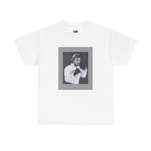 Chuck Norris unisex heavyweight tee shirt featuring a fierce fighting stance, frozen in black-and-white glory. A tribute to raw strength and unshakable legend, it’s more than a shirt—it’s a statement of fearless dominance.