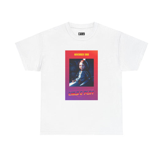 Child’s Play unisex heavyweight tee shirt featuring Chucky grinning with a knife framed in fiery neon. Marked “November 1988,” it’s a sinister tribute to the birth of a legend. A must-have for fans who dare wear the nightmare.