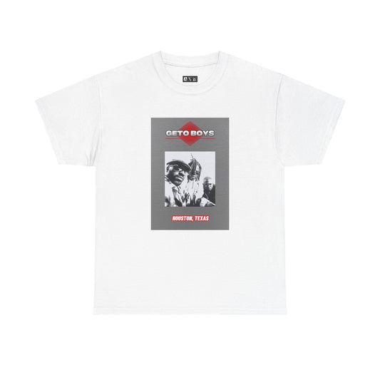 Geto Boys unisex heavyweight tee shirt featuring a gritty black-and-white photo of the group, framed with a gray panel. “GETO BOYS” blazes at the top in red and white, with Houston, Texas stamped below — pure Southern hip-hop pride.