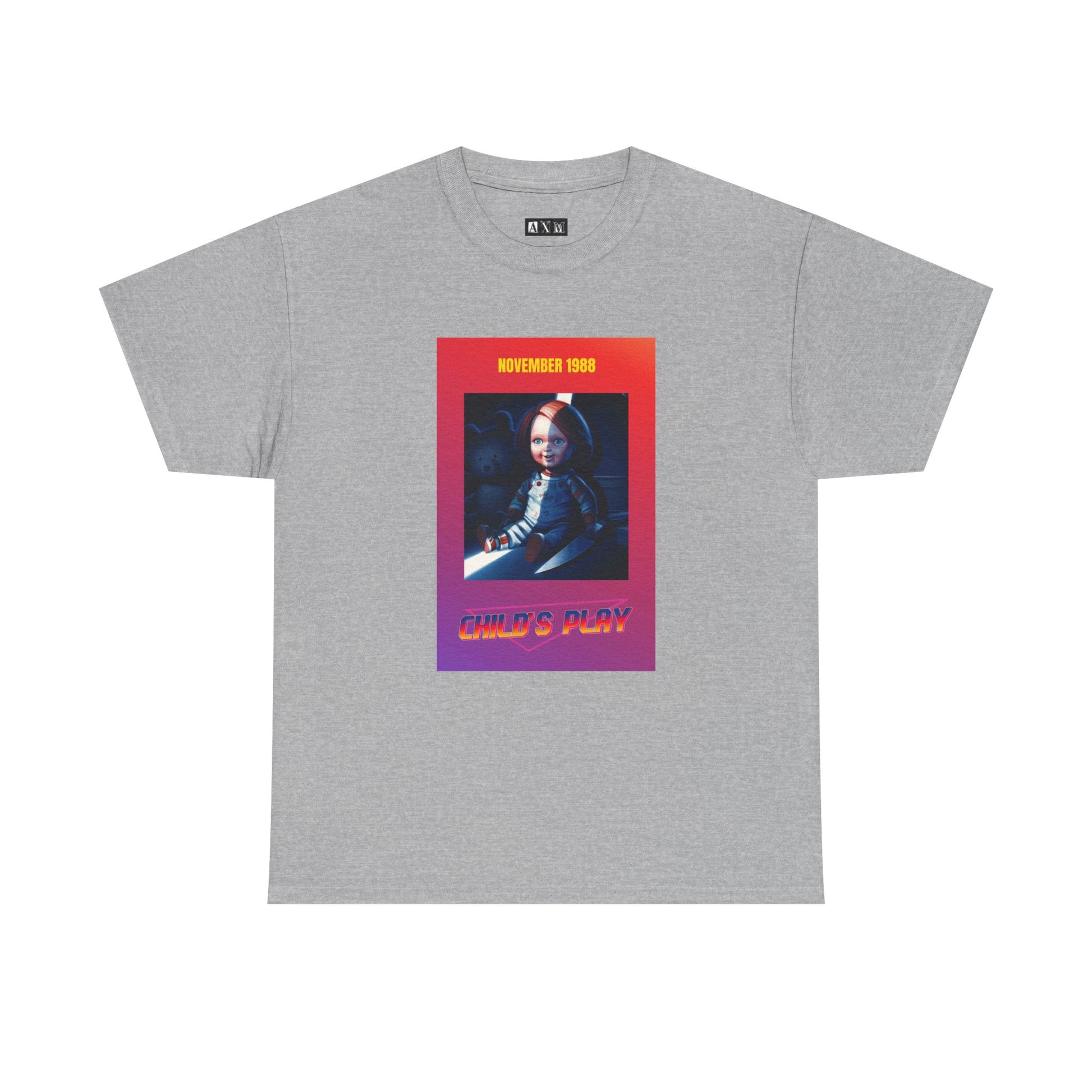 Child’s Play unisex heavyweight tee shirt featuring Chucky grinning with a knife framed in fiery neon. Marked “November 1988,” it’s a sinister tribute to the birth of a legend. A must-have for fans who dare wear the nightmare.