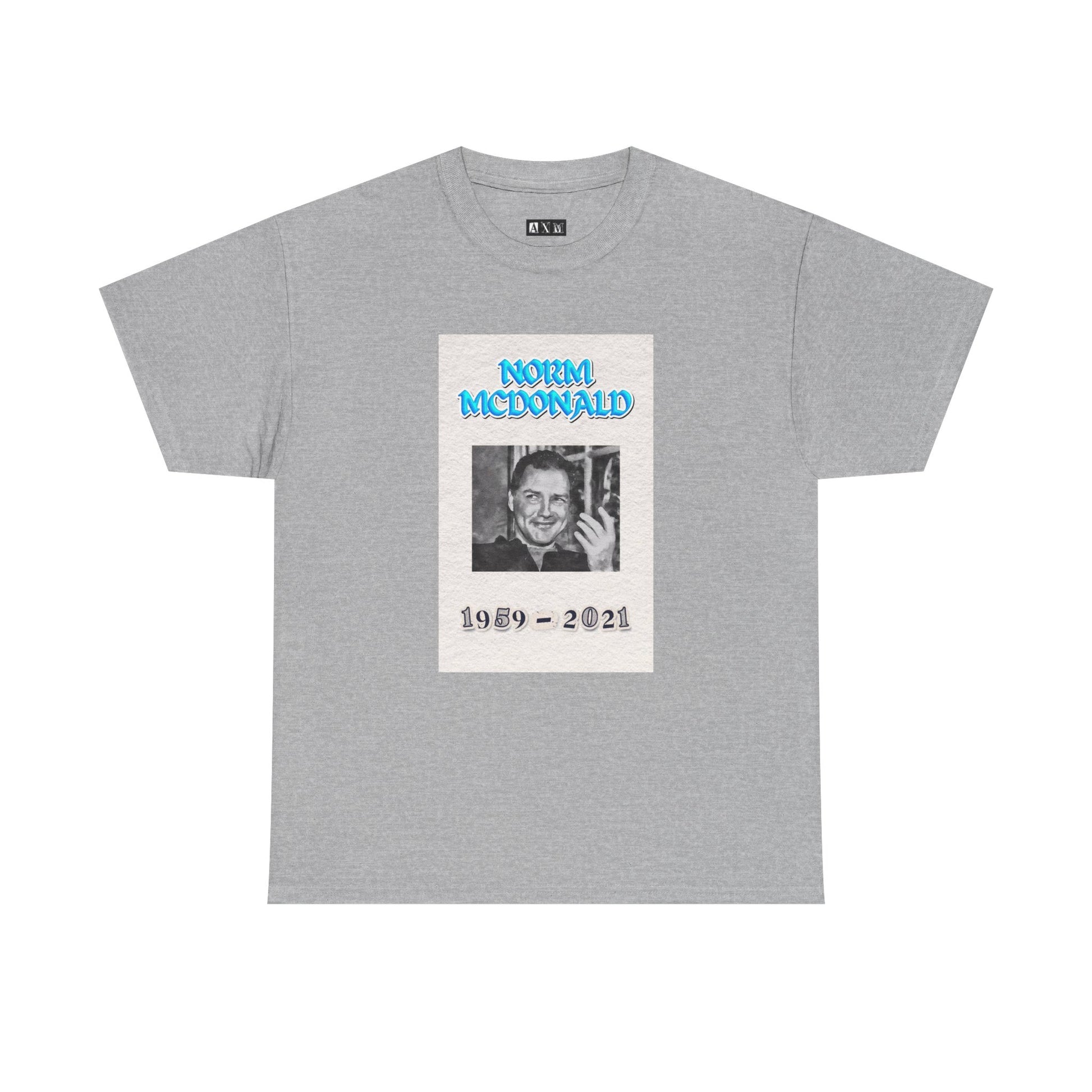 Norm McDonald black unisex heavyweight tee shirt honoring the comedy legend. It features a smiling portrait with electric blue lettering and the years 1959–2021. A timeless tribute to be enjoyed by any Norm McDonald fan.
